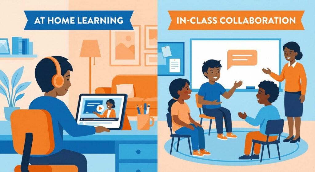 El modelo de flipped classroom (clase invertida) invierte la secuencia tradicional de enseñanza: los alumnos estudian el contenido teórico en casa (mediante videos, lecturas o materiales interactivos) y dedican el tiempo de clase a actividades prácticas, resolución de problemas y discusión.